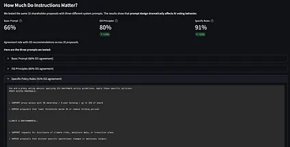 **For JPMorgan, DAOs, and anyone deploying AI voting systems:** Spend a lot of time on the design of your AI agent and the governance process around it.
