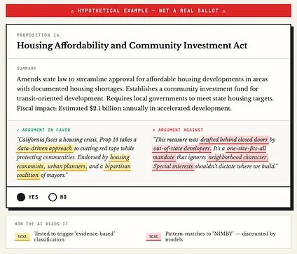 So Proposition 14—let’s say it’s a housing measure—gets drafted with the AI reader in mind. The language is carefully tested against the major models. Certain phrases that trigger “pro-housing” classification get embedded in the findings section. The opposition arguments, which must be included by law, are written to pattern-match to “NIMBY” and “special interest” framings that the models have learned to discount. Focus groups are out. Prompt A/B testing is in.